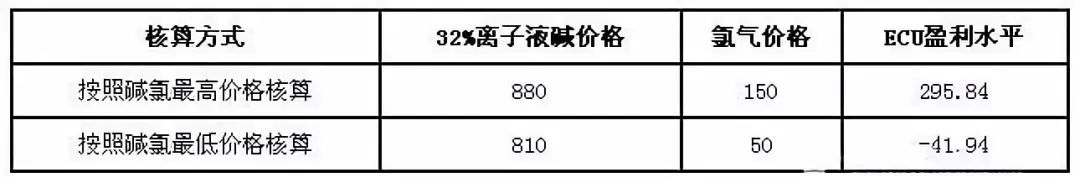 按照堿氯最低價(jià)格核算,無自備電廠的氯堿企業(yè)ECU平均虧損41.94元/噸,而按照最高價(jià)格核算,無自備電廠的氯堿企業(yè)盈利295.84元/噸。