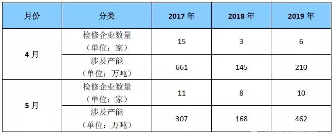 表1 2017-2019年4-5月燒堿檢修廠家及涉及產能統(tǒng)計表